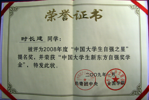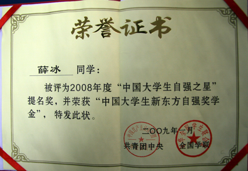在前不久结束的2008年度“中国大学生自强之星”评选中,kaiyun官网时长建和薛冰同学获得提名奖,并荣获“中国大学生新东方自强奖学金”。