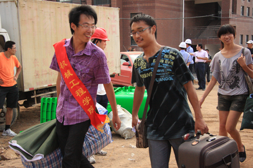 和着喜庆的礼花齐鸣,校党委耿喜华书记一行亲自陪送2010级第一批入住新生到嘉陵江路新校区。在新校区的七公寓,耿喜华书记一行看望了刚刚入住的土木学院、机械学院新生和新生家长,代表学校送上了关怀和问候。新生家长对自己的孩子第一批入住新校区感到荣幸,并对学校领导的关怀表示衷心感谢!