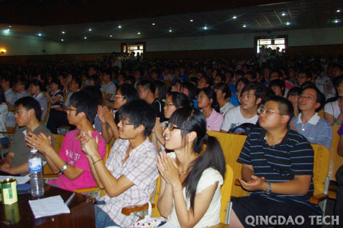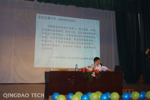报告会在热烈的气氛中拉开序幕。谭业庭院长首先致词,他详细向观众介绍了郑强教授的事迹。郑强教授是教育部“长江学者”特聘教授、国家杰出青年基金获得者、首批新世纪百千万人才工程国家级人选、教育部科学技术委员会委员、教育部教学指导委员会委员,浙江大学党委副书记,博士生导师,连续三次当选为“浙江大学学生心目中最喜爱的教师”,在网友中被亲切的称为“强哥”,“史上最牛愤青教授”。近年来,他先后应邀到学校、机关、企业、部队,作有关爱国主义和人文素养方面的专题报告近200场,受到热烈欢迎。中央电视《东方时空》、《人民日报》、《中国青年报》等予以专题报道,产生很大的社会反响。