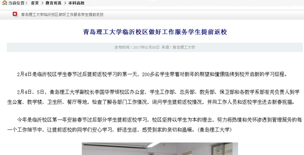 今年是临沂校区第一年安排春节过后部分学生提前返校学习,校区坚持以学生为本的理念,努力将热情和关怀渗透到管理服务的每一个工作细节中,让提前返校的同学们安心学习、舒适生活,感受到家的亲切和温暖。