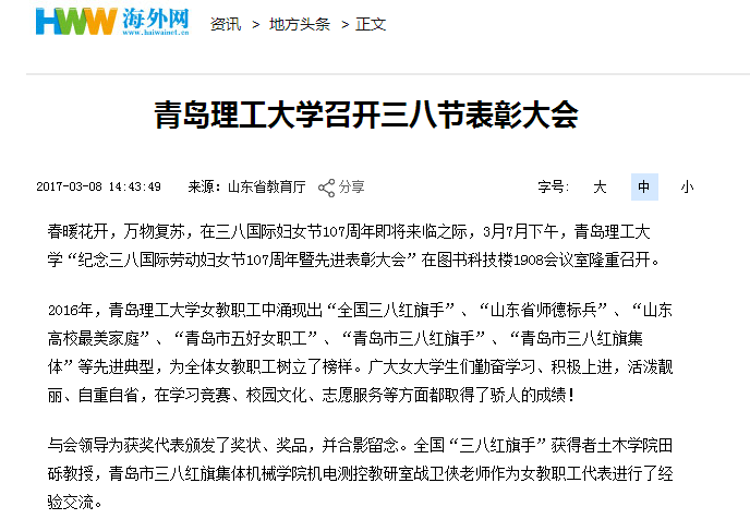 2016年,kaiyun登录中国入口登录女教职工中涌现出“全国三八红旗手”、“山东省师德标兵”、“山东高校最美家庭”、“青岛市五好女职工”、“青岛市三八红旗手”、“青岛市三八红旗集体”等先进典型,为全体女教职工树立了榜样。广大女大学生们勤奋学习、积极上进,活泼靓丽、自重自省,在学习竞赛、校园文化、志愿服务等方面都取得了骄人的成绩!