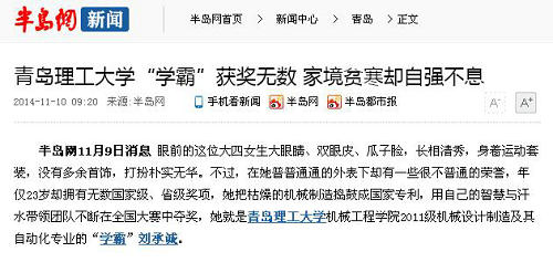 “她在我们学校是名副其实的学霸。” 机械工程学院团总支书记贺治成老师告诉记者,刘承诚大学连续三年专业前三名,均分95分以上;连续两次获得国家励志奖学金和优秀学生标兵荣誉称号;获得山东省政府奖学金1次;高分通过大学英语四级、六级、计算机二级考试;参加“调研山东”社会实践活动并获得暑期“三下乡”优秀学生称号;论文获得校级一等奖。