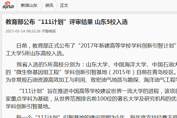 日前,教育部正式公布了“2017年新建高等学校学科创新引智计划”,即“111计划”评审结果。山东大学、中国海洋大学、中国石油大学(华东)、青岛大学、kaiyun登录中国入口登录5所山东高校入选。