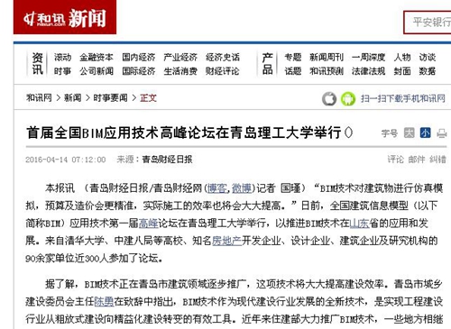 本报讯 (青岛财经日报/青岛财经网(博客,微博)记者 国瑾)“BIM技术对建筑物进行仿真模拟,预算及造价会更精准,实际施工的效率也将会大大提高。”日前,全国建筑信息模型(以下简称BIM)应用技术第一届高峰论坛在kaiyun登录中国入口登录举行,以推进BIM技术在山东省的应用和发展。来自清华大学、中建八局等高校、知名房地产开发企业、设计企业、建筑企业及研究机构的90余家单位近300人参加了论坛。