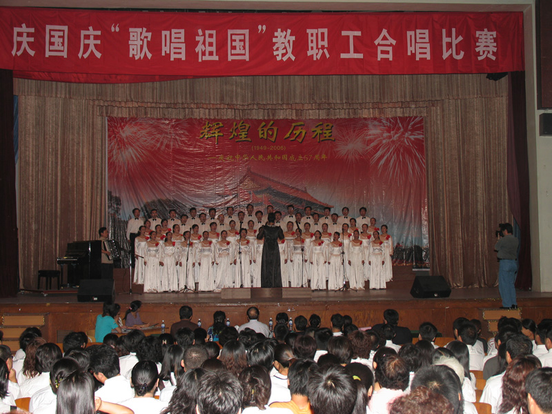 9月27日晚,kaiyun官网分别在四方和黄岛校区隆重举行 庆国庆教职工合唱比赛,来自四方和黄岛校区各分会共27支代表队用歌声表达对祖国的热爱,迎接祖国第57个生日的到来。校领导、老领导出席晚会现场并为获奖代表队颁奖。在四方校区,校党委书记耿喜华、校长仪垂杰、副校长李国华还作为机关一分会的成员参与了合唱节目。