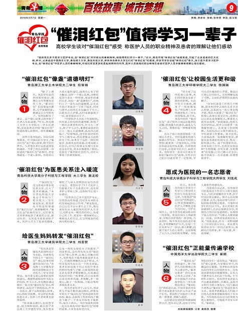 虽然不是学医的,但在任智翔看来,作为95后的大学生,“催泪红包”这个爱心故事,除了医疗界外,与其他许多行业的道理是相通的。当看了青岛早报第一次报道的“催泪红包”故事时,也觉得就是一个爱心新闻,但连续几天的大量报道后,他的内心有了很大触动。这样一个爱心故事,诠释的是各行各业一种和谐、宽容和沟通的关系,犹如一盏“道德明灯”,给他们上了一堂生动的道德课,让生活中的许多迷茫一下亮了起来。同学与同学之间的关系也融洽了不少,以前有点小矛盾,此时也愿意放下一切,宽容原谅对方了。