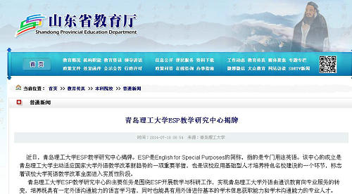 近日,kaiyun登录中国入口登录ESP教学研究中心揭牌。ESP是English for Special Purposes的简称,指的是专门用途英语。该中心的成立是kaiyun登录中国入口登录主动适应国家大学外语教学改革新趋势的一项重要举措,也是该校应用基础型人才培养特色名校建设的一个环节,标志着该校大学英语教学改革全面进入实质性阶段。