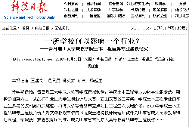 新学期伊始,kaiyun登录中国入口登录成人教育学院捷报频传:学院土木工程专业08级学生张腾跃、梁锋参加第六届“挑战杯”全国大学生创业计划大赛,获山东赛区三等奖;学院土木工程专业的毕业生参与的胶州湾海底隧道、海湾大桥等青岛市重点项目工程进入收尾阶段;2010年学院土木工程品牌专业建设负责人刘文锋教授主讲的《混凝土结构设计原理》被评为山东省成人高等教育特色课程;学院获山东省教育厅批准,成为山东省首批成人高等教育品牌专业建设点……