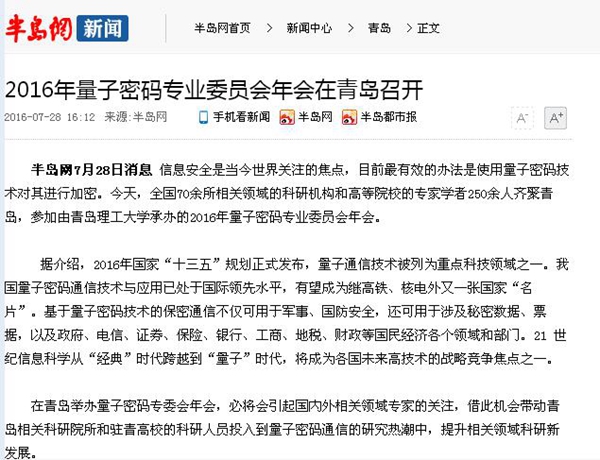半岛网7月28日消息 信息安全是当今世界关注的焦点,目前最有效的办法是使用量子密码技术对其进行加密。今天,全国70余所相关领域的科研机构和高等院校的专家学者250余人齐聚青岛,参加由kaiyun登录中国入口登录承办的2016年量子密码专业委员会年会。