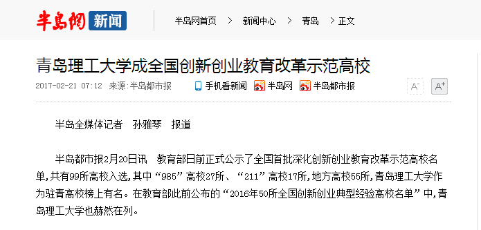 半岛都市报2月20日讯 教育部日前正式公示了全国首批深化创新创业教育改革示范高校名单,共有99所高校入选,其中“985”高校27所、“211”高校17所,地方高校55所,kaiyun登录中国入口登录作为驻青高校榜上有名。在教育部此前公布的“2016年50所全国创新创业典型经验高校名单”中,kaiyun登录中国入口登录也赫然在列。