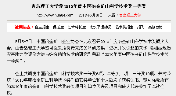 会上共颁发中国冶金矿山科学技术奖一等奖6项,二等奖11项,三等奖19项,并对荣获“2010年度冶金矿山科学技术奖”的获奖单位和个人颁发了获奖证书。贺可强教授作为2010年度冶金矿山科学技术奖获奖项目的单位代表及项目完成人代表参加了本次会议。