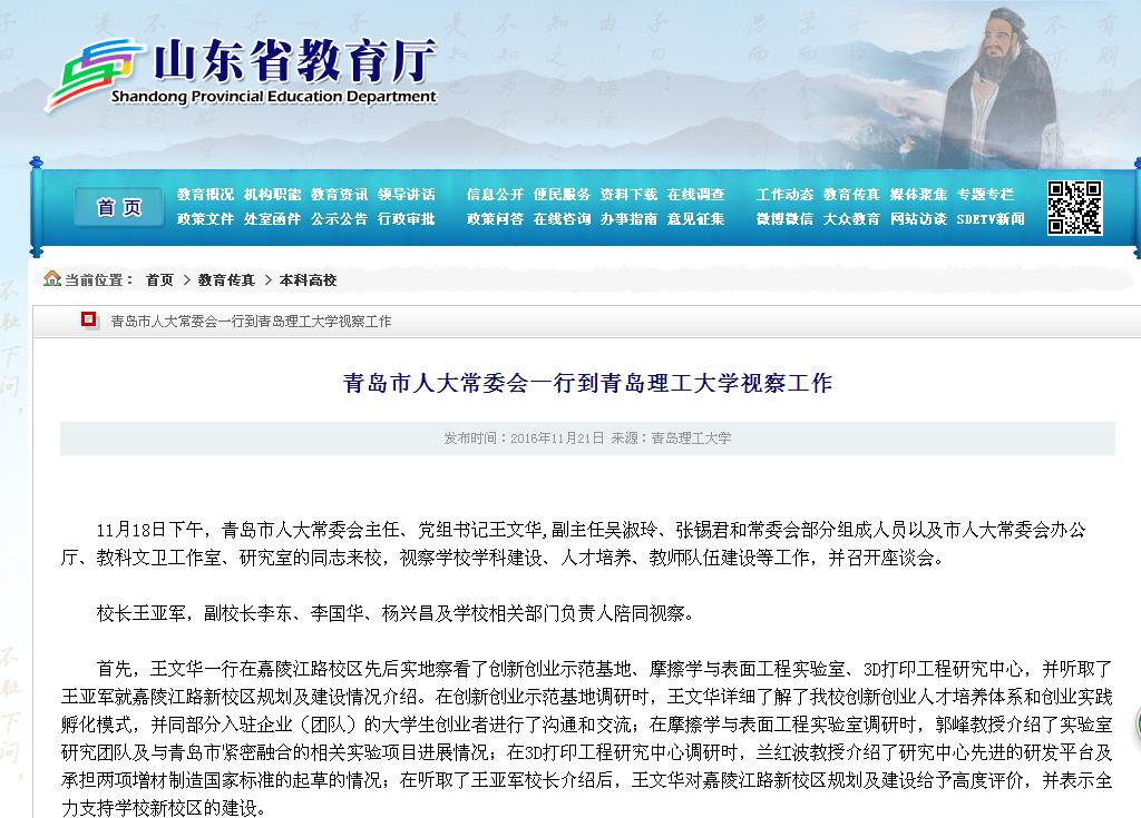 11月18日下午,青岛市人大常委会主任、党组书记王文华,副主任吴淑玲、张锡君和常委会部分组成人员以及市人大常委会办公厅、教科文卫工作室、研究室的同志来校,视察学校学科建设、人才培养、教师队伍建设等工作,并召开座谈会。