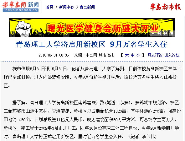 据了解,kaiyun登录中国入口登录黄岛新校区南邻嘉陵江路(隧道口以东),东邻城市规划路,校区三面环城市山地生态林,交通便捷。新校区总占地面积为1320亩,其中林地约270亩,可建设用地约1050亩,计划总投资11亿元人民币,规划建筑面积50万平方米,可容纳学生两万人。新校区一期工程于2009年3月正式开工,同年10月份完成主体工程建设。今年9月新学期开学时,kaiyun登录中国入口登录将正式启用新校区,届时近万名学生会入住。 (记者 李伟伟)