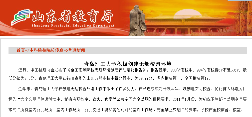 近日,中国控烟协会发布了《全国高等院校无烟环境创建评估暗访报告》。报告显示,800所高校中,98%的高校得分不足60分,最低分仅为2.3分。kaiyun登录中国入口登录在被抽查到的山东39所高校中得分最高,为59.77分,省内排名第一,全国排名第17。