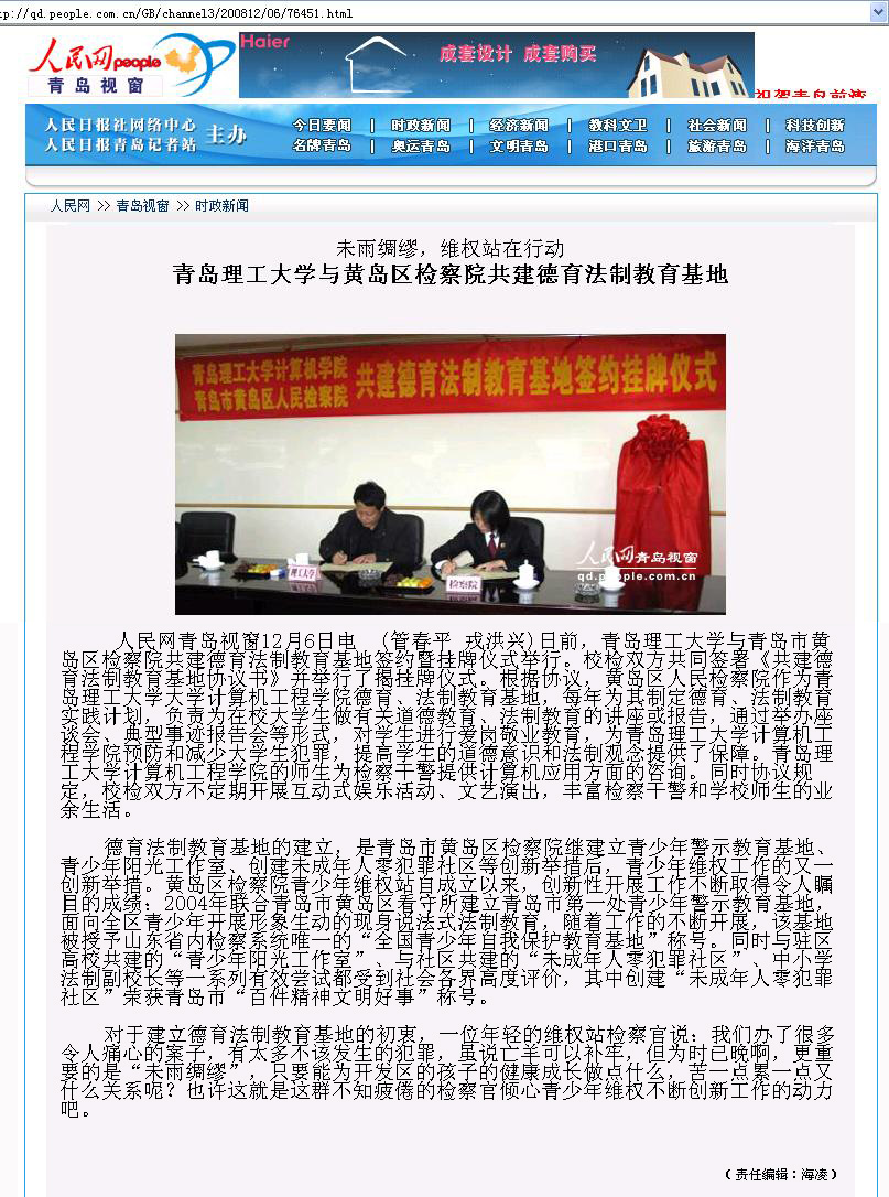 人民网青岛视窗12月6日电(管春平 戎洪兴)日前,kaiyun登录中国入口登录与青岛市黄岛区检察院共建德育法制教育基地签约暨挂牌仪式举行。校检双方共同签署《共建德育法制教育基地协议书》并举行了揭挂牌仪式。根据协议,黄岛区人民检察院作为kaiyun登录中国入口登录大学计算机工程学院德育、法制教育基地,每年为其制定德育、法制教育实践计划,负责为在校大学生做有关道德教育、法制教育的讲座或报告,通过举办座谈会、典型事迹报告会等形式,对学生进行爱岗敬业教育,为kaiyun登录中国入口登录计算机工程学院预防和减少大学生犯罪,提高学生的道德意识和法制观念提供了保障。kaiyun登录中国入口登录计算机工程学院的师生为检察干警提供计算机应用方面的咨询。同时协议规定,校检双方不定期开展互动式娱乐活动、文艺演出,丰富检察干警和学校师生的业余生活。