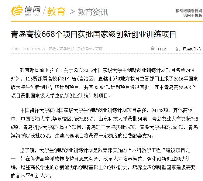 教育部日前下发了《关于公布2016年国家级大学生创新创业训练计划项目名单的通知》,116所部属高校和31个省(自治区、直辖市)的地方教育主管部门上报了2016年国家级大学生创新创业训练计划项目,共有33054项计划项目通过审批。其中青岛高校668个项目获批国家级大学生创新创业训练计划项目。