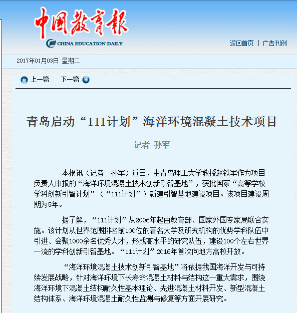 中国教育报:青岛启动“111计划”海洋环境混凝土技术项目