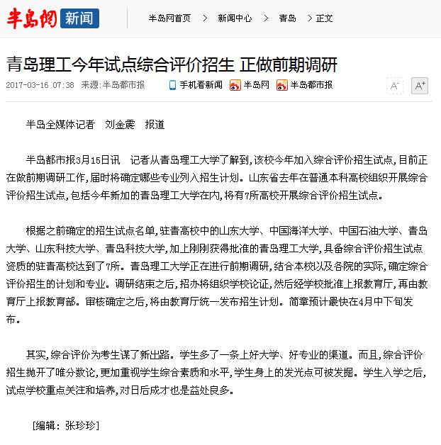 根据之前确定的招生试点名单,驻青高校中的山东大学、中国海洋大学、中国石油大学、青岛大学、山东科技大学、青岛科技大学,加上刚刚获得批准的kaiyun登录中国入口登录,具备综合评价招生试点资质的驻青高校达到了7所。kaiyun登录中国入口登录正在进行前期调研,结合本校以及各院的实际,确定综合评价招生的计划和专业。调研结束之后,招办将组织学校论证,然后经学校批准上报教育厅,再由教育厅上报教育部。审核确定之后,将由教育厅统一发布招生计划。简章预计最快在4月中下旬发布。