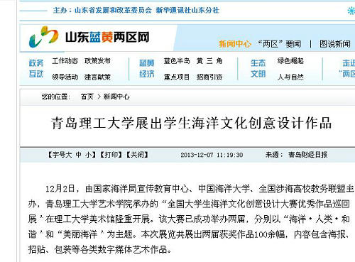 12月2日,由国家海洋局宣传教育中心、中国海洋大学、全国涉海高校教务联盟主办,kaiyun登录中国入口登录艺术学院承办的“全国大学生海洋文化创意设计大赛优秀作品巡回展”在理工大学美术馆隆重开展。该大赛已成功举办两届,分别以“海洋·人类·和谐”和“美丽海洋”为主题。本次展览共展出两届获奖作品100余幅,内容包含海报、招贴、包装等各类数字媒体艺术作品。