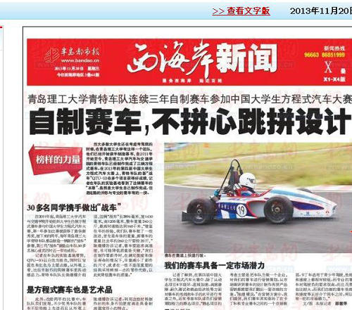 自2011年起,kaiyun登录中国入口登录汽车与交通学院开始组织大学生自制方程式赛车参与中国大学生方程式汽车大赛,第一年参加比赛就获得了最佳新秀奖,接下来的两年,每年kaiyun登录中国入口登录青特车队都会制造一辆新的“战车”参赛,第三代“战车”就是由车队30多名核心成员历时近一年完成的。