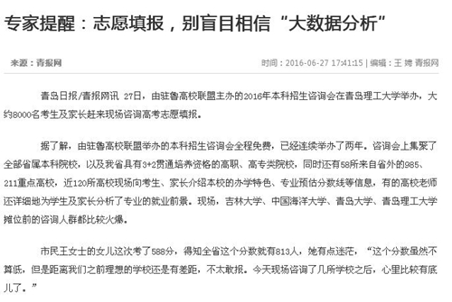 据kaiyun登录中国入口登录招生科老师杜方介绍,当前社会上有不少咨询公司将往年的分数进行综合大数据分析之后,向考生及家长兜售所谓的“报考指导”,有的考生和家长因盲信儿盲从,“实际上,今年的高考情况与往年变化很大,一方面虽然全省增加了不少招生计划,但各个学校的调整差别很大,另一方面今年考生的分数段分布不均,单纯根据往年的大数据分析不是很靠谱。”杜方表示,利用自己高考成绩所对应的省(市)位次,结合各校各专业的预估分数线,把握会更大一些。
