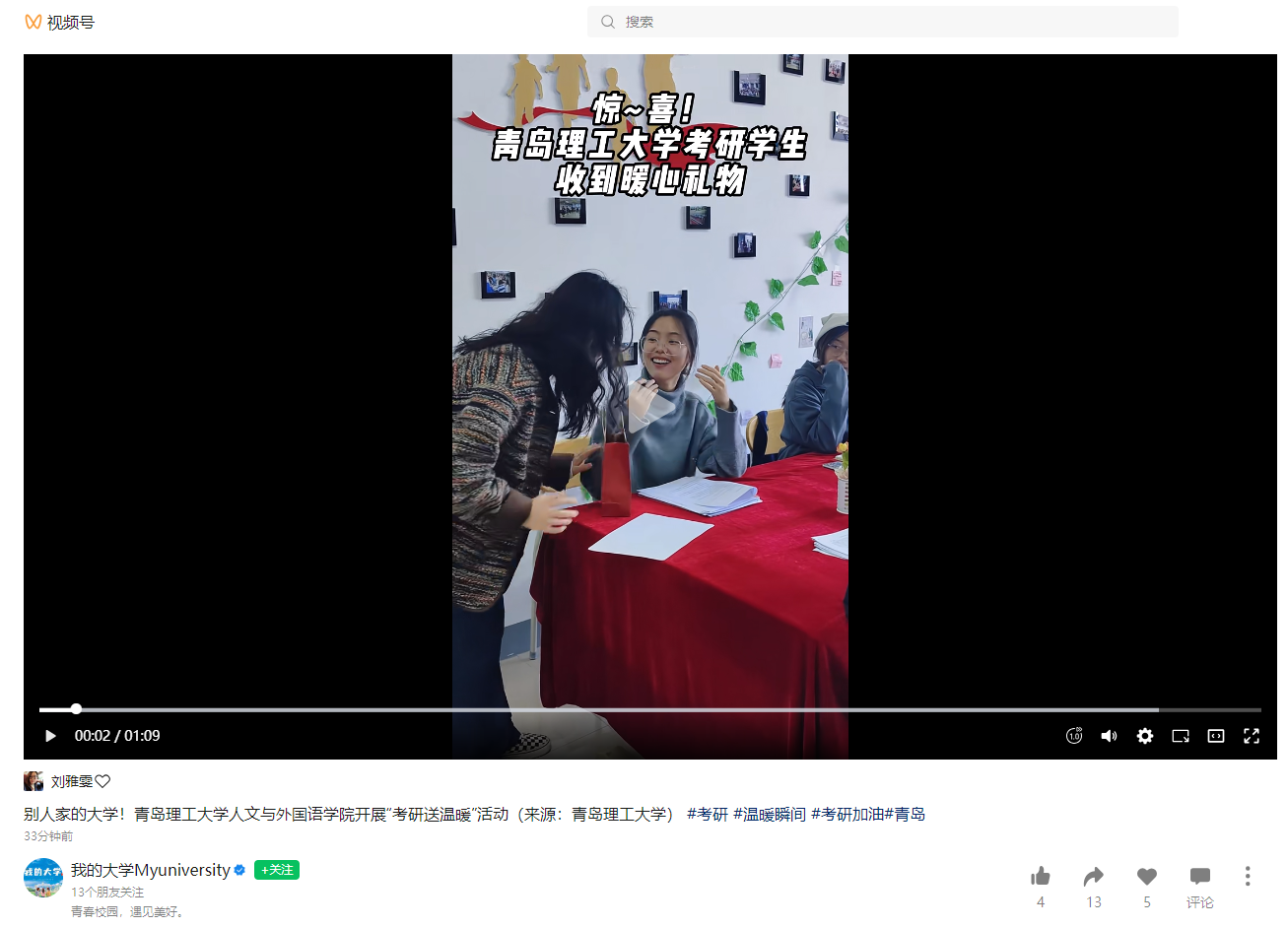 青岛市广播电视台视频号:别人家的大学!kaiyun登录中国入口登录人文与外国语学院开展“考研送温暖”活动